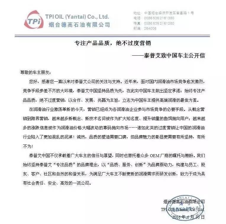 您好,感謝您一直以來對(duì)泰普艾公司的關(guān)注與支持。近年來,面對(duì)國(guó)內(nèi)潤(rùn)滑油市場(chǎng)競(jìng)爭(zhēng)愈發(fā)激烈,競(jìng)爭(zhēng)手段參差不齊的大環(huán)境,泰普艾中國(guó)堅(jiān)持品質(zhì)為先,在此向中國(guó)車主做出堅(jiān)定承諾:始終專注產(chǎn)品品質(zhì),絕不過度營(yíng)銷,以合作、發(fā)展、共贏為主旨,立志為中國(guó)車主提供高端潤(rùn)滑的最佳方案。