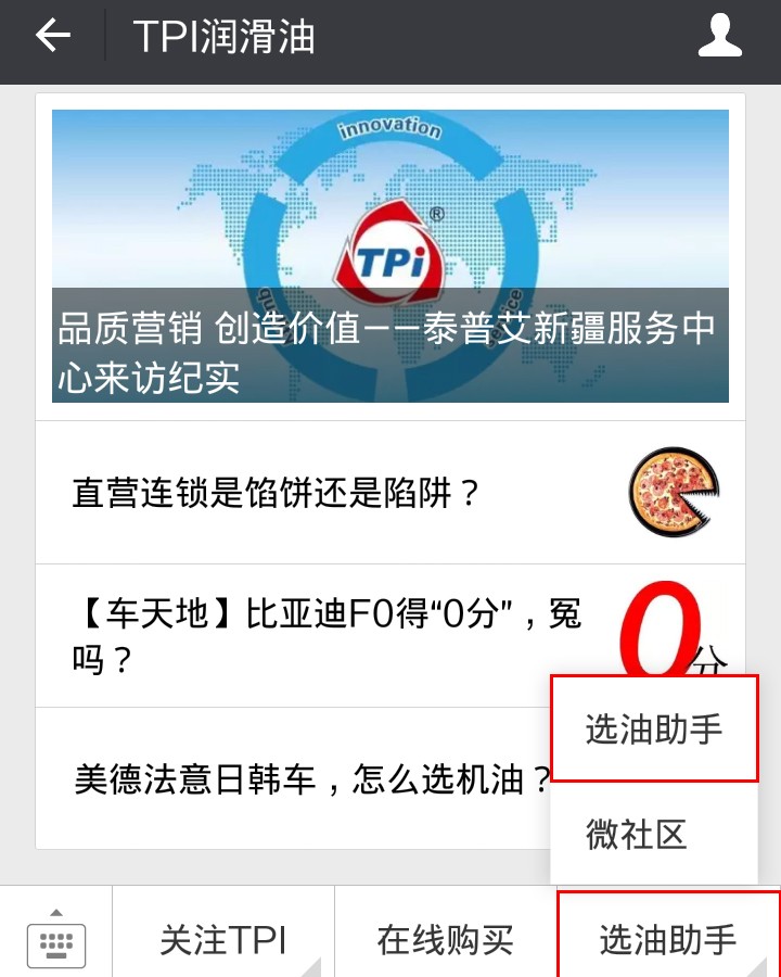 關(guān)注泰普艾潤滑油微信公眾號(TPI4007006919),進入微信公眾平臺,點擊選油助手,即可進入泰普艾潤滑油選油助手頁面