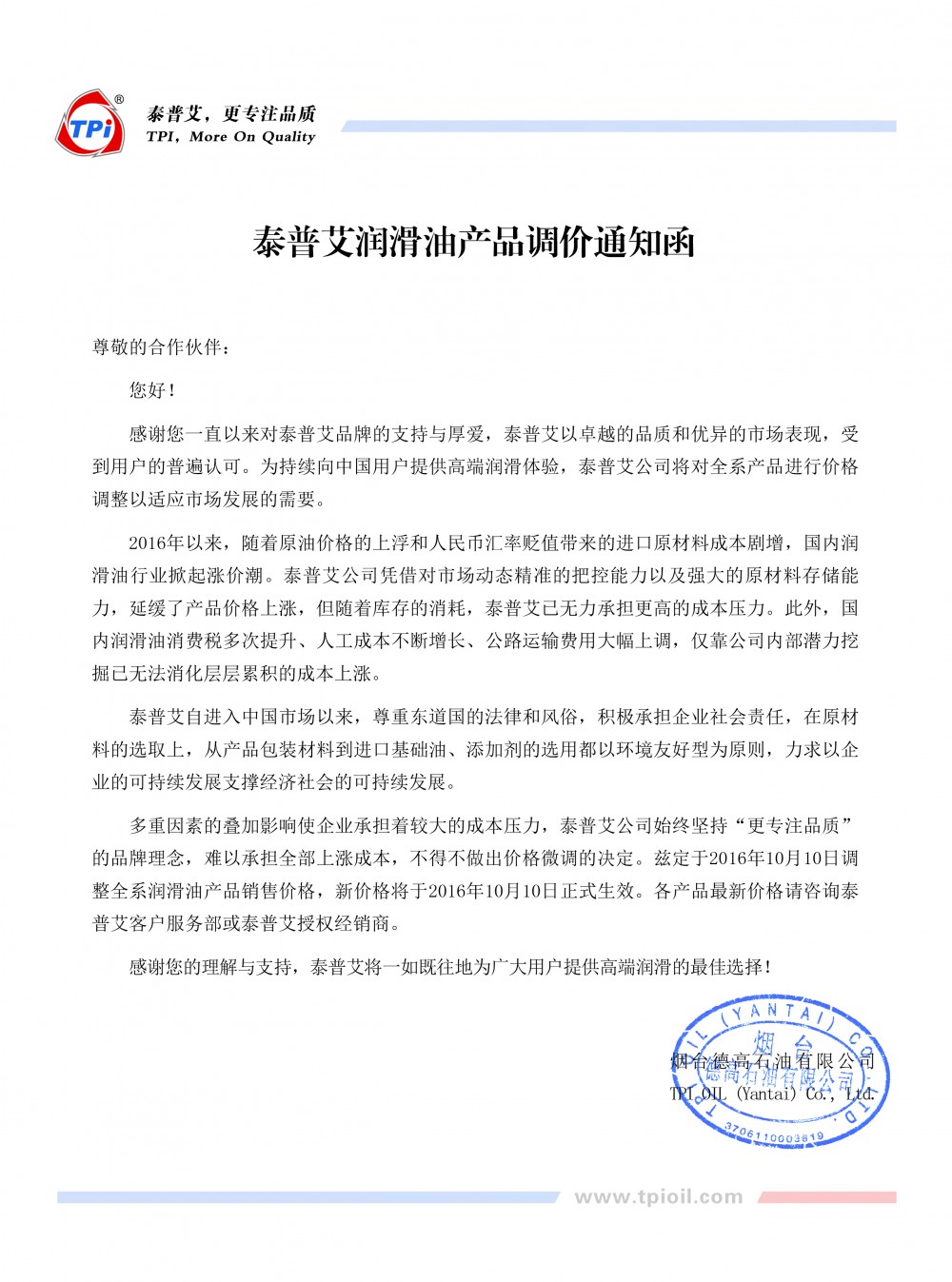 多重因素的疊加影響使企業(yè)承擔(dān)著較大的成本壓力,泰普艾公司始終堅(jiān)持“更專注品質(zhì)”的品牌理念,難以承擔(dān)全部上漲成本,不得不做出價(jià)格微調(diào)的決定。茲定于2016年10月10日調(diào)整全系潤(rùn)滑油產(chǎn)品銷售價(jià)格,新價(jià)格將于2016年10月10日正式生效。各產(chǎn)品最新價(jià)格請(qǐng)咨詢泰普艾客戶服務(wù)部或泰普艾授權(quán)經(jīng)銷商。